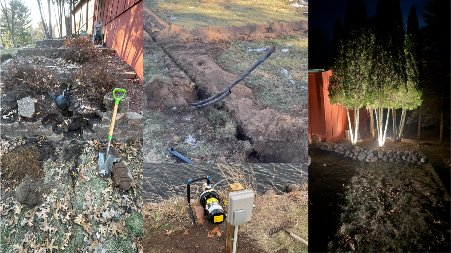 It all started with a yard on Lake Sherwood, with an old, broken down irrigation system that had ran the well that supplied the house with water, dry. The rotors had sprayed the house and hardscape more than the lawn, as if they grow any larger, if only. The lawn looked like someone was trying to grow grass in the Sahara. With dreams of a greener, healthier lawn, former apprentice lineman Aedan got to work making repairs to the system, expanding it and using science to make sure every blade of grass got just the right amount of water. One year later, the lawn was so smooth and green you could walk on it with no shoes! All it needed now, was some lighting to complement the beauty that had grown.